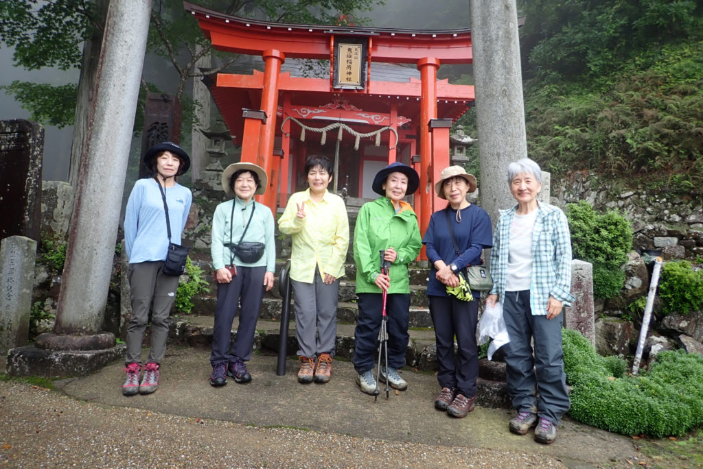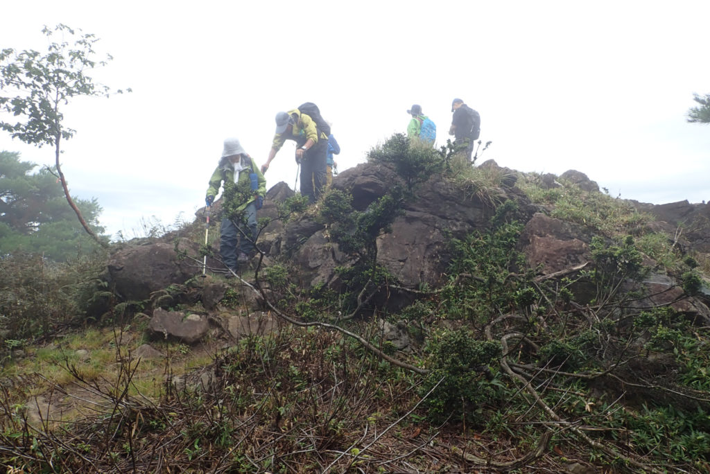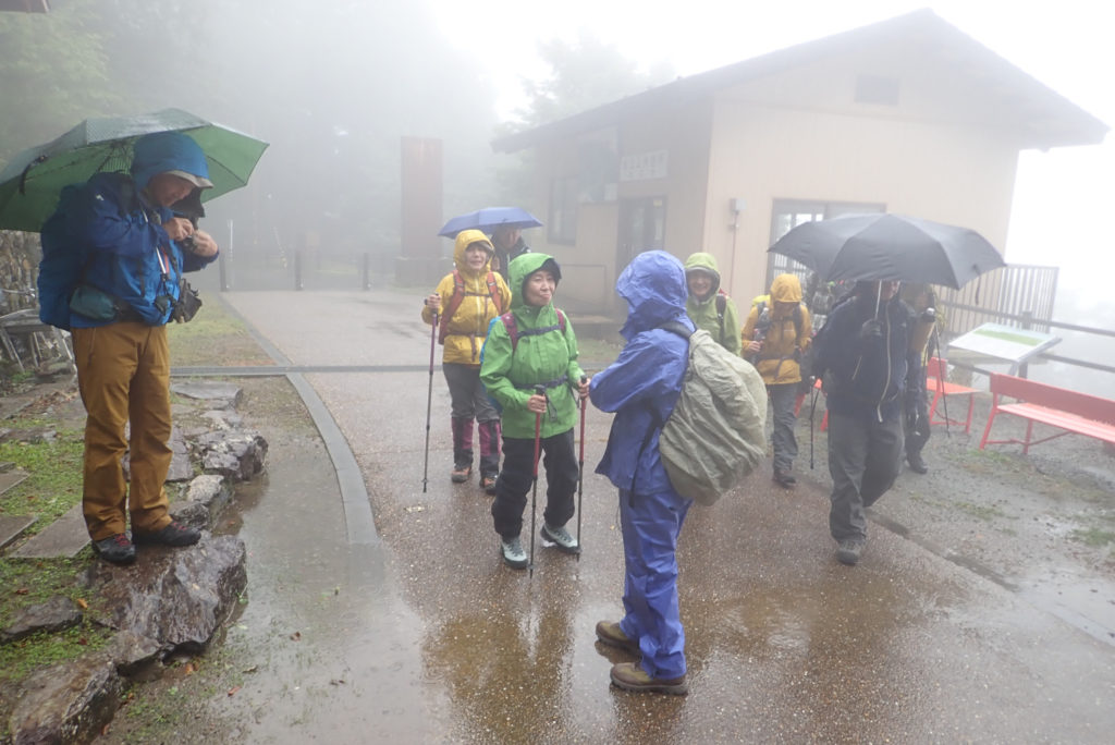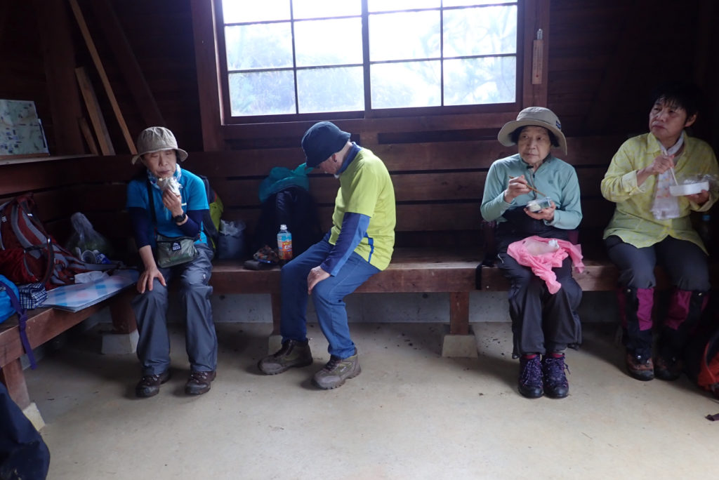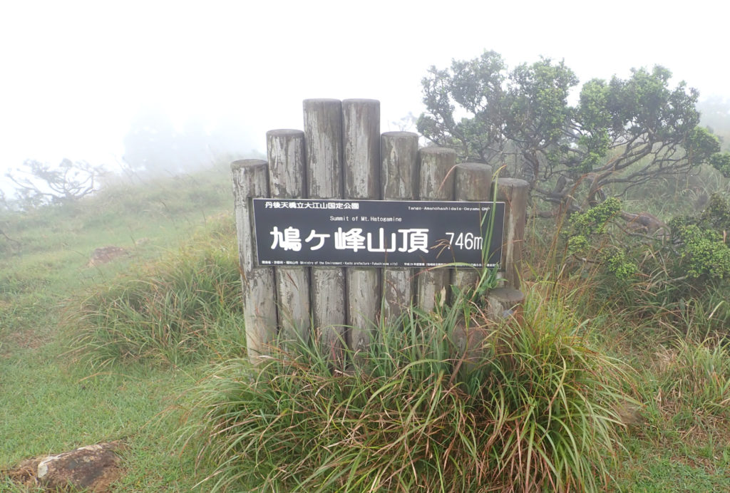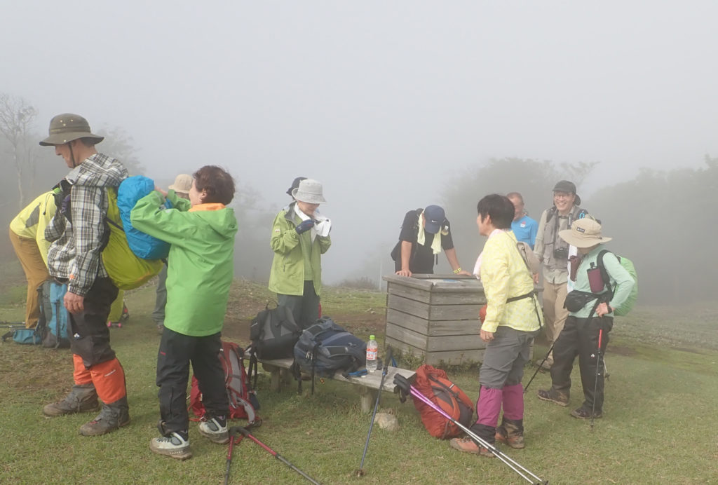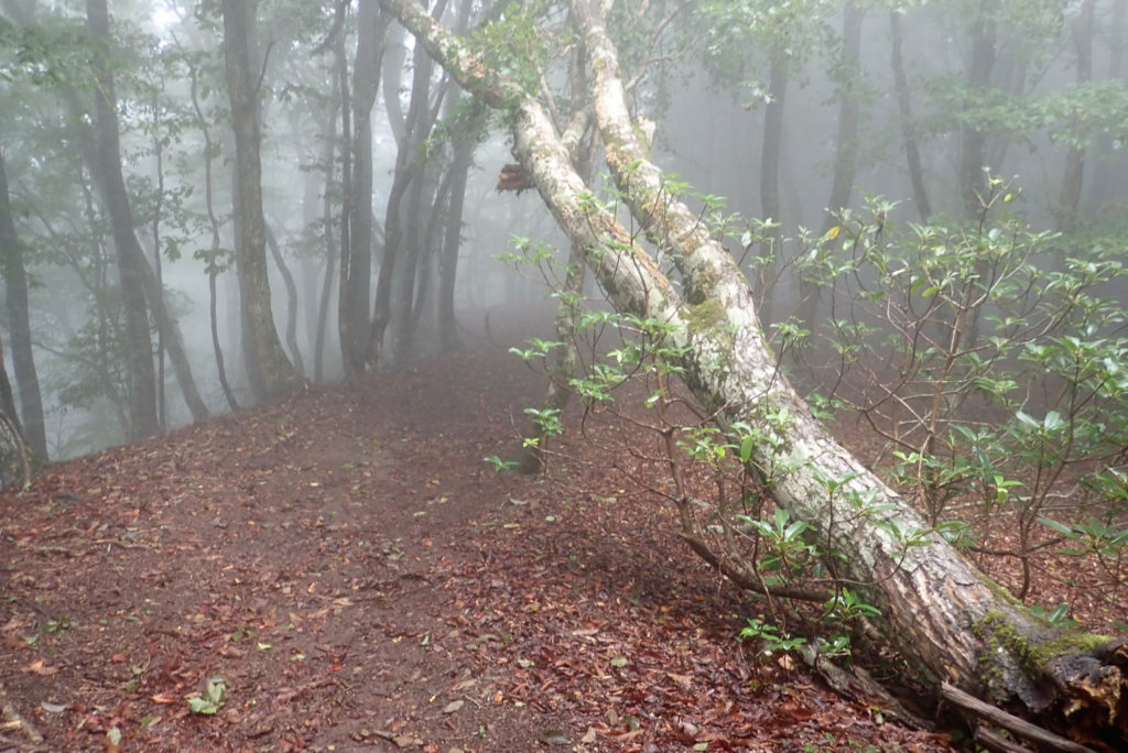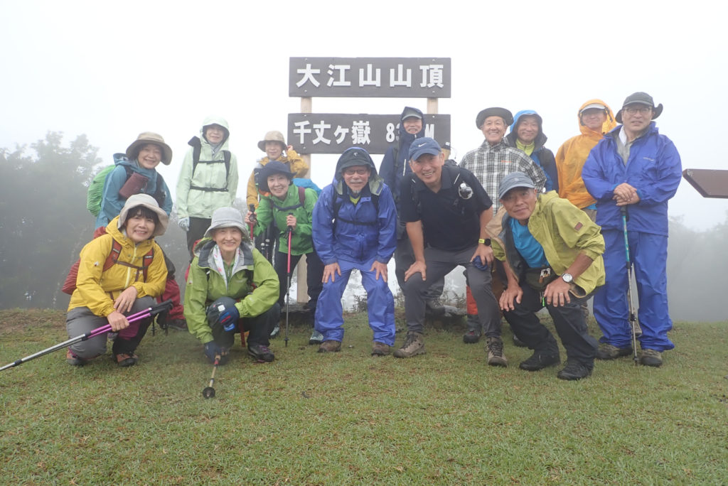 時には雨天の山行も訓練になっていいかと思い実施した。出発点の鬼嶽稲荷神社前にくると小雨となり気にならなくなってきた。登山口からはいきなりの急登である。霧の中の幻想的なブナ、ミズナラ、トチなどの巨樹に目を奪われながら登っていくと前方が急に平らになり大江山頂上に到着した。後は鍋塚山山頂までは多少のアップダウンを繰り返すものの淡々と稜線歩きである。やがて雨もほとんど気にならない空模様となり、遠くの山々が見えはじめ安堵した。参加者の思いやりの精神に助けられて全員が予定のコースを完歩出来た。 (中村 記)