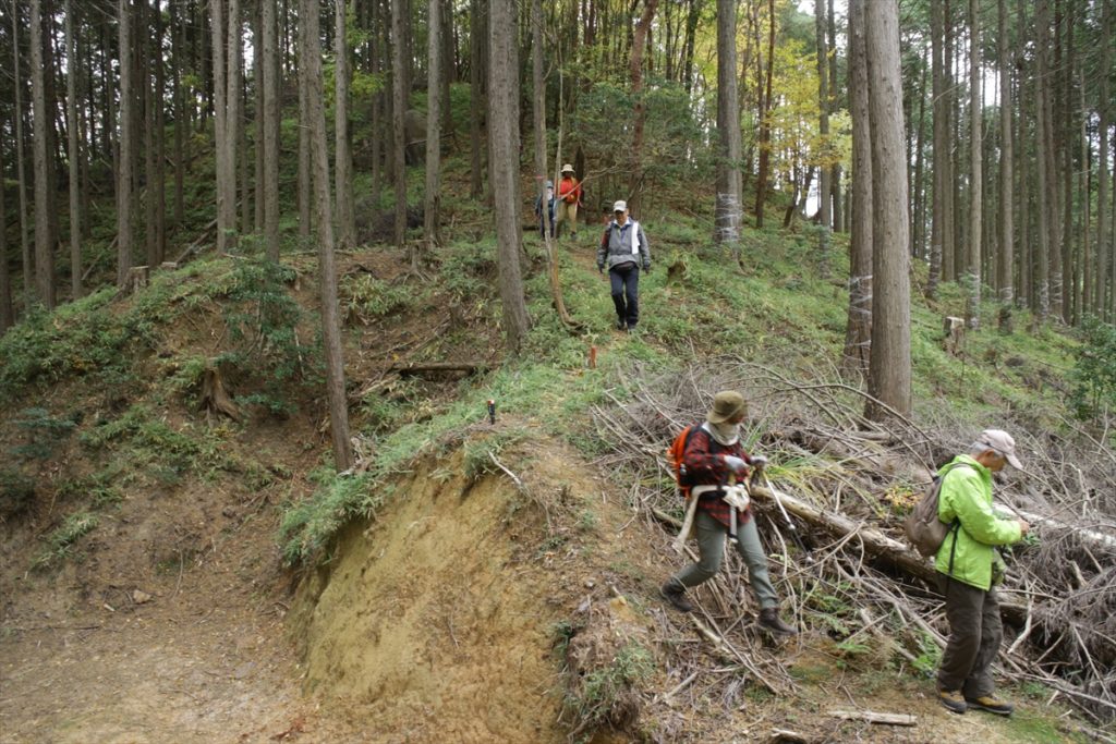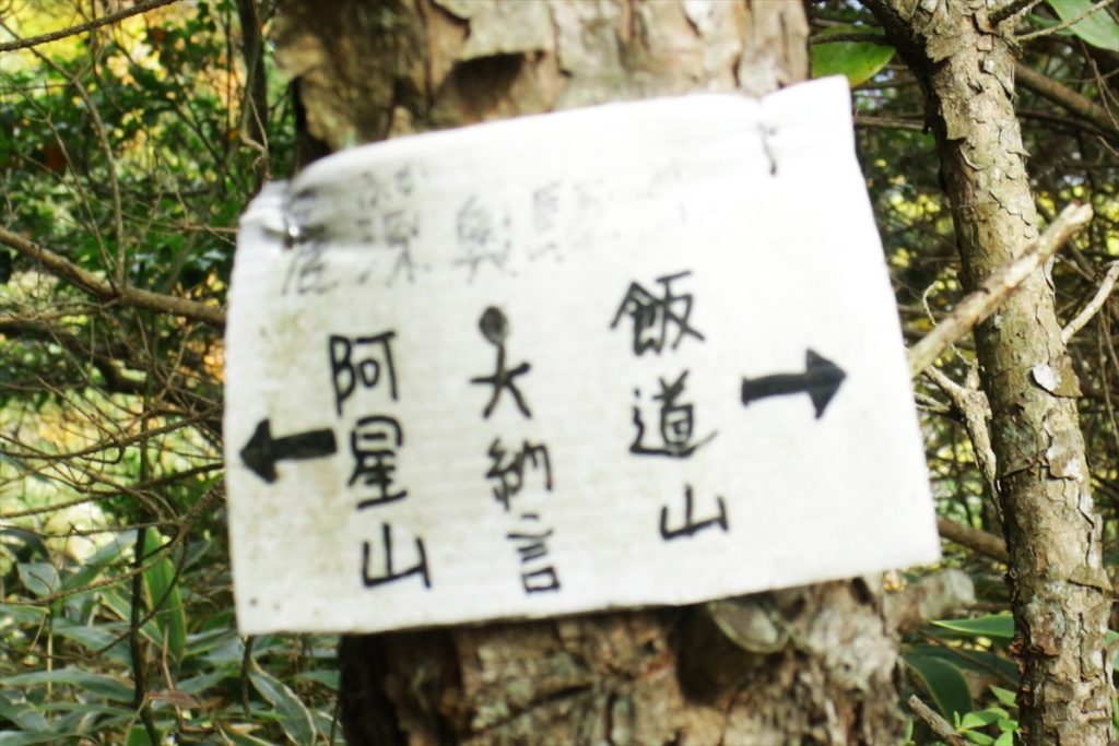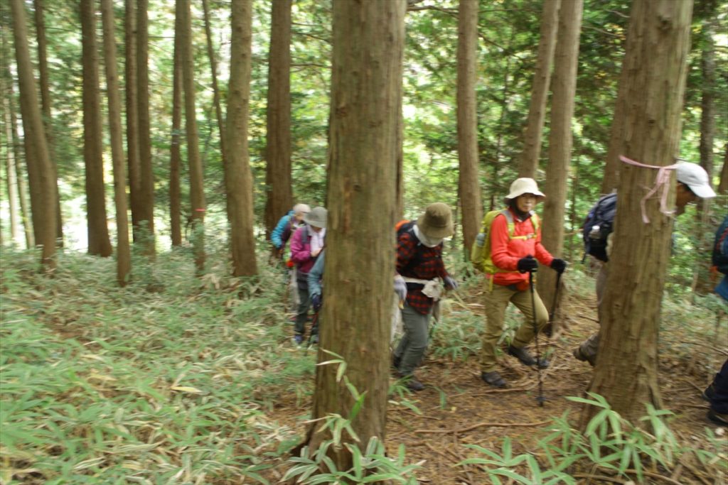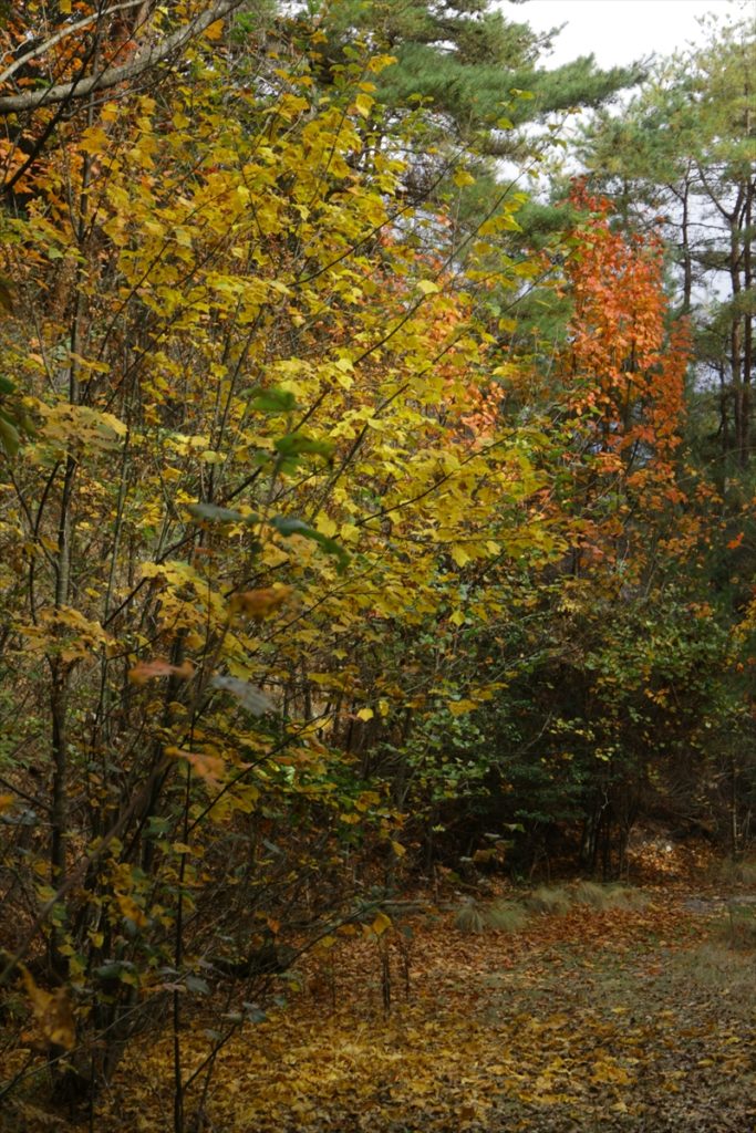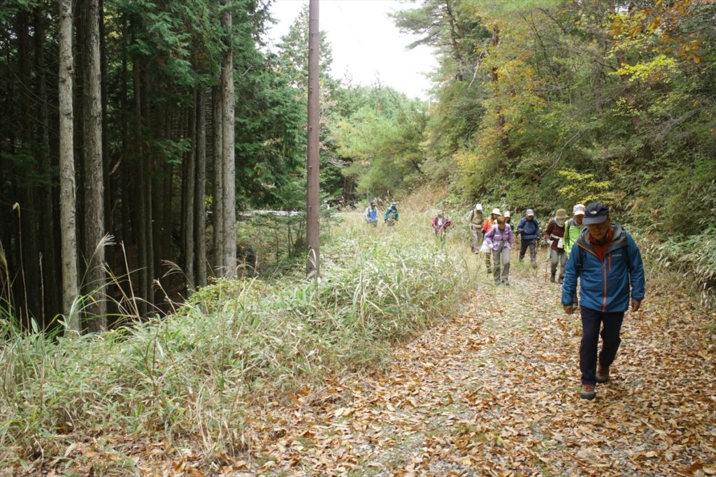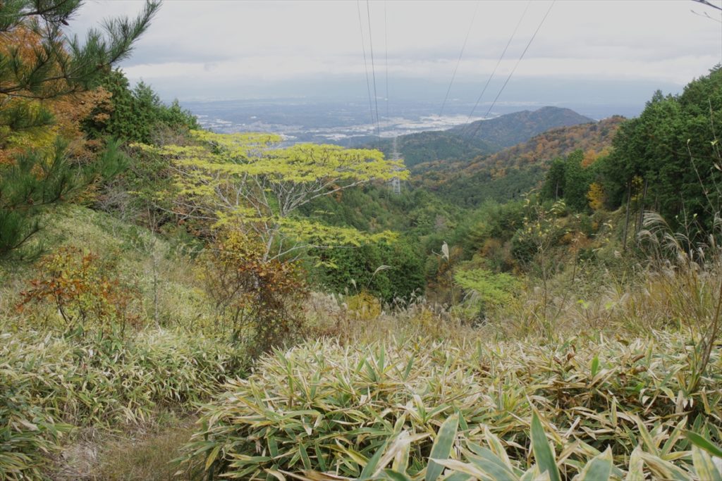峠からの取り付きは笹の生い茂った急斜面に続くちょっとしたざれ場を上ると後は小さな登り降りをして・548西ほうそ山に至る。湿原を横切り行政の境界標識に沿って尾根を辿ると昔の地図では大納言と書かれている(ののへら(・583.0m)に至る。途中でNTTの中継アンテナに続く林道に出てすぐに最高点の大納言(・596)に到着する。(但し、独標地点はNTTの施設内もしくは林道上の様で確認することが出来なかった)ササユリ保護地の看板からは琵琶湖や湖北の山々が望める。風を避けて電波中継所の鉄柵門扉の前で食事を摂り、その後、秋の陽射しに映える紅葉、黄葉を楽しみながら林道に沿って下山する。(池野 記)