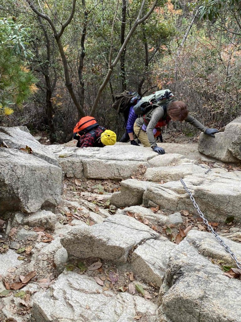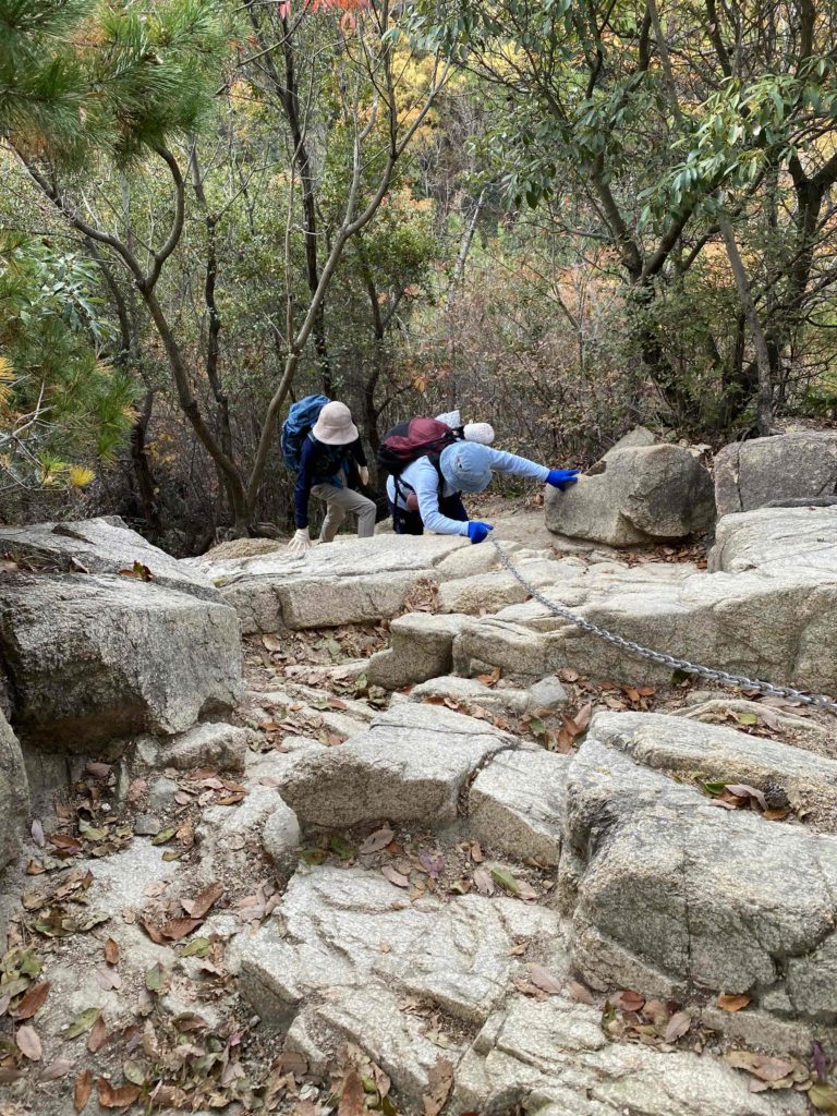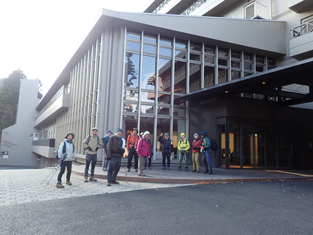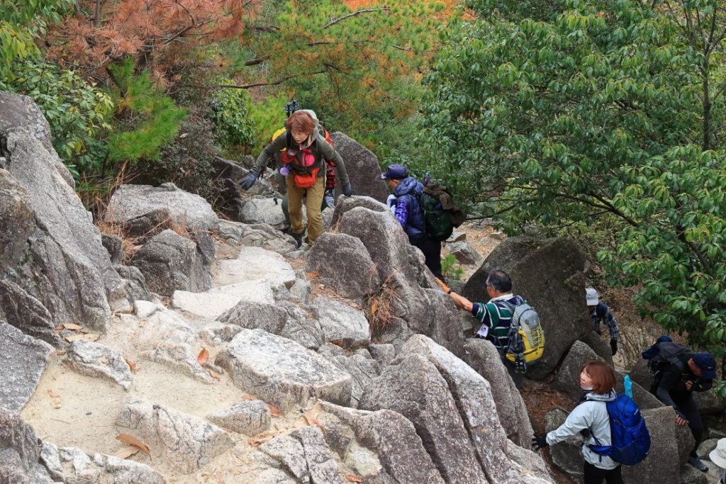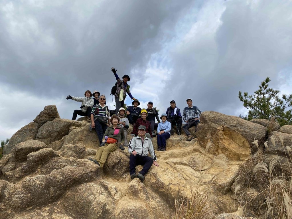 阪急・芦屋川駅で集合し、高座ノ滝から登山をスタート。ロックガーデン中央稜の露岩帯では、よじ登るような岩場や鎖場もあり、結構楽しめた。風吹岩では全員が岩によじ登り記念写真を撮った。雨ケ峠を過ぎると渡渉があり、本庄橋から七曲り道へ入ると、急勾配の道が待っていた。一軒茶屋近くの休憩所で昼食をとった。その後、六甲最高峰へ登頂、大阪湾を一望できる大パノラマが広がっていた。下山は魚屋道を有馬温泉へ下った。落ち葉を踏みしめながら慎重に歩いていくと、温泉街の湯煙が見え、冷え切った身体がようやくほっとした気持ちになった。有馬温泉で入浴し、疲れがすっと抜けていくのを感じながら、今回の冬の六甲山歩きの余韻を味わった。(文・駒田 写真・三木、中川敦、駒田)