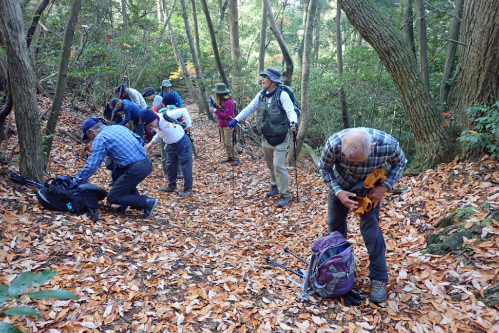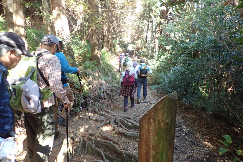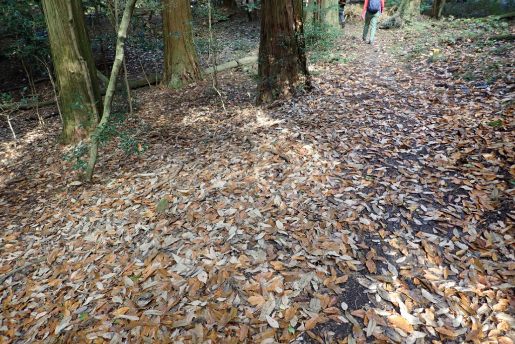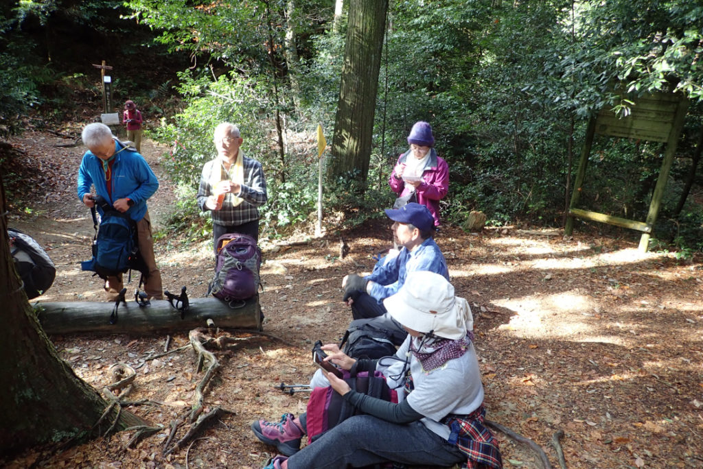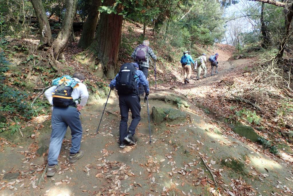 今日は暖かいせいか、蹴上駅から水路閣までは観光客が多い。水路閣から山道に入るが、道はこんなに勾配がきつかったかな?休憩予定の七福思案処まで待てず、皆さん衣服調整していた。七福思案処からトレイル40までの道も、後半はかなりの勾配があり、トレイル道の手前で休憩。そこから先も何回か小休止しながら林道と合流する44-2まで来る。ここで10分以上の時間調整をして奥の広場に行く予定だったが、休みすぎたかな?5分ほどで出発。集合時間の10分前に先頭で到着と思っていたが、B班の到着で集合はもう少し奥だと分かった。 (文、斉藤・写真、中村)