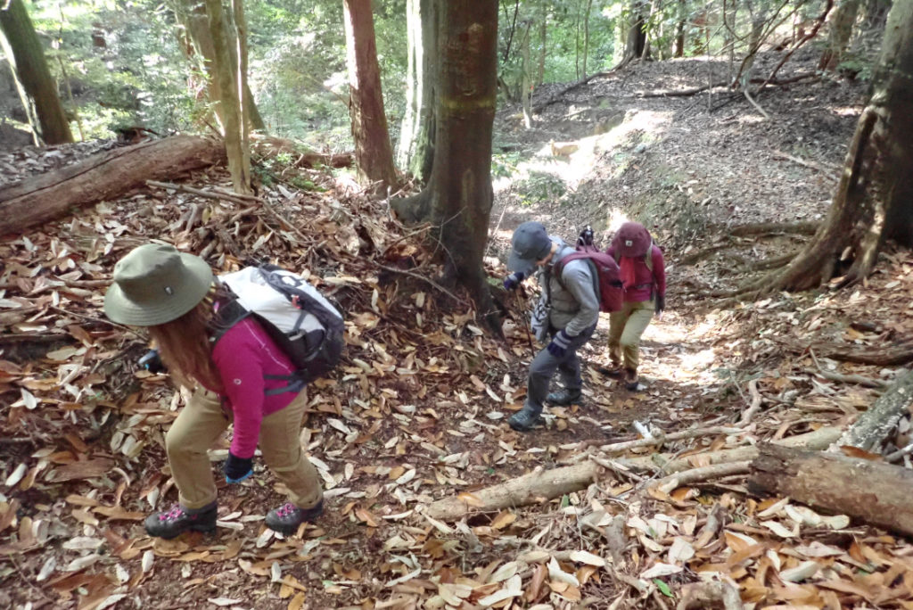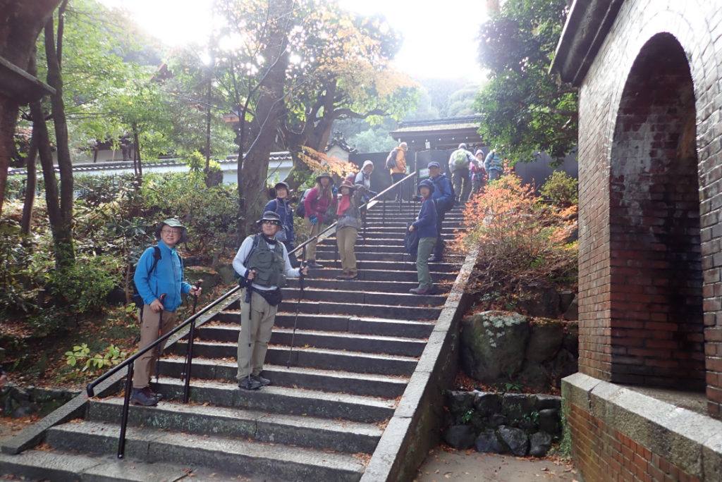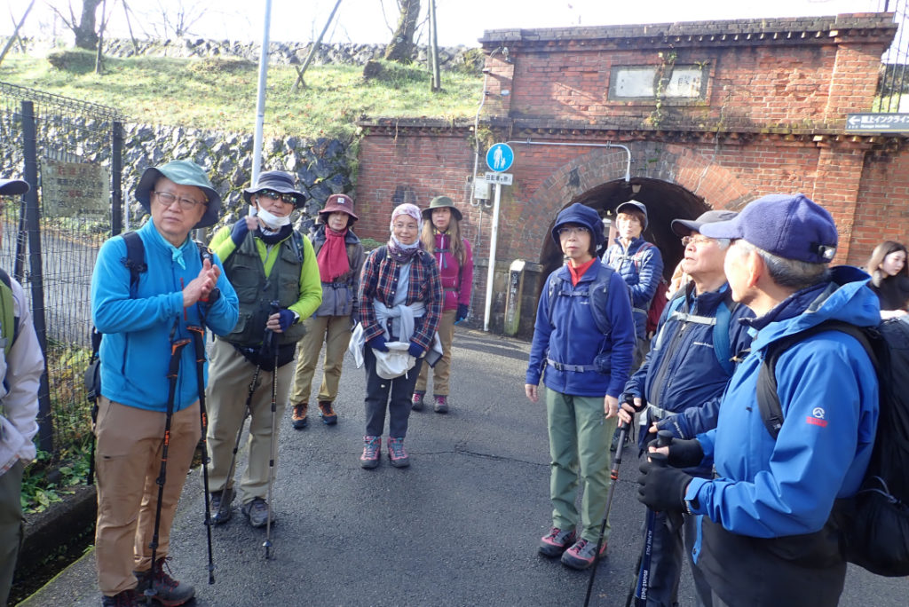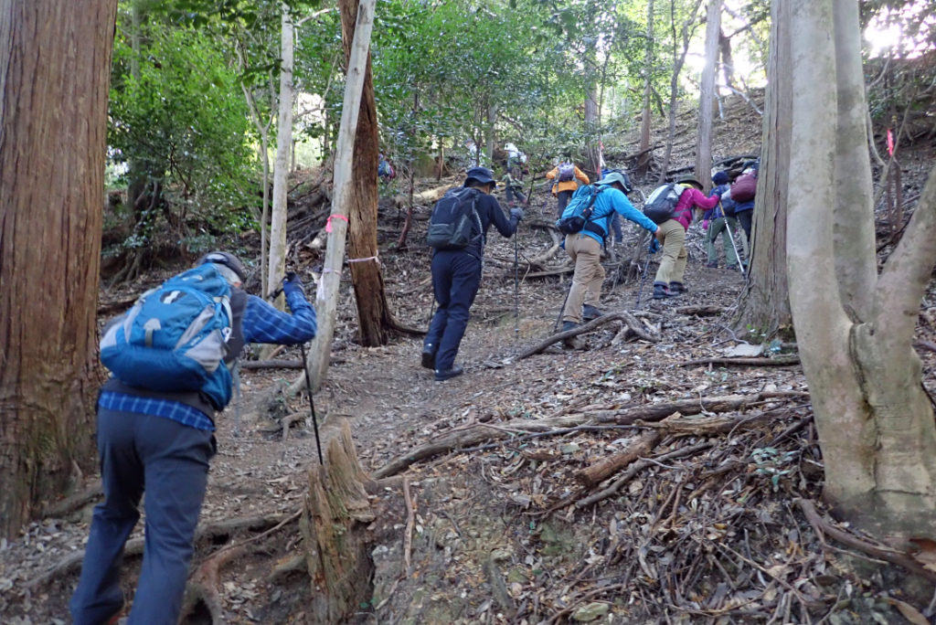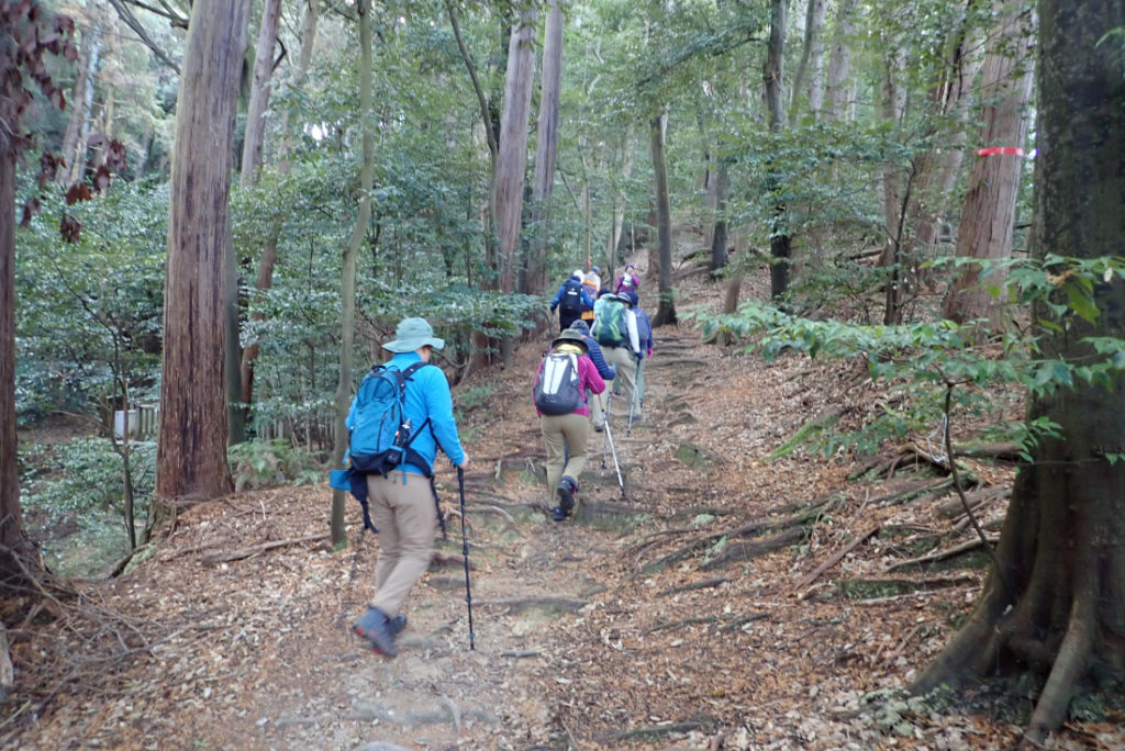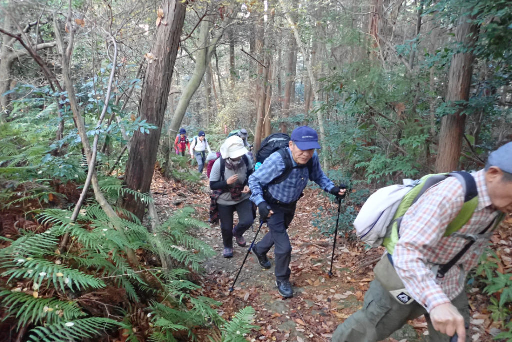 今日は暖かいせいか、蹴上駅から水路閣までは観光客が多い。水路閣から山道に入るが、道はこんなに勾配がきつかったかな?休憩予定の七福思案処まで待てず、皆さん衣服調整していた。七福思案処からトレイル40までの道も、後半はかなりの勾配があり、トレイル道の手前で休憩。そこから先も何回か小休止しながら林道と合流する44-2まで来る。ここで10分以上の時間調整をして奥の広場に行く予定だったが、休みすぎたかな?5分ほどで出発。集合時間の10分前に先頭で到着と思っていたが、B班の到着で集合はもう少し奥だと分かった。 (文、斉藤・写真、中村)