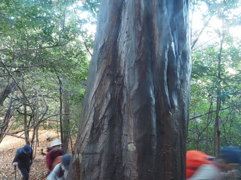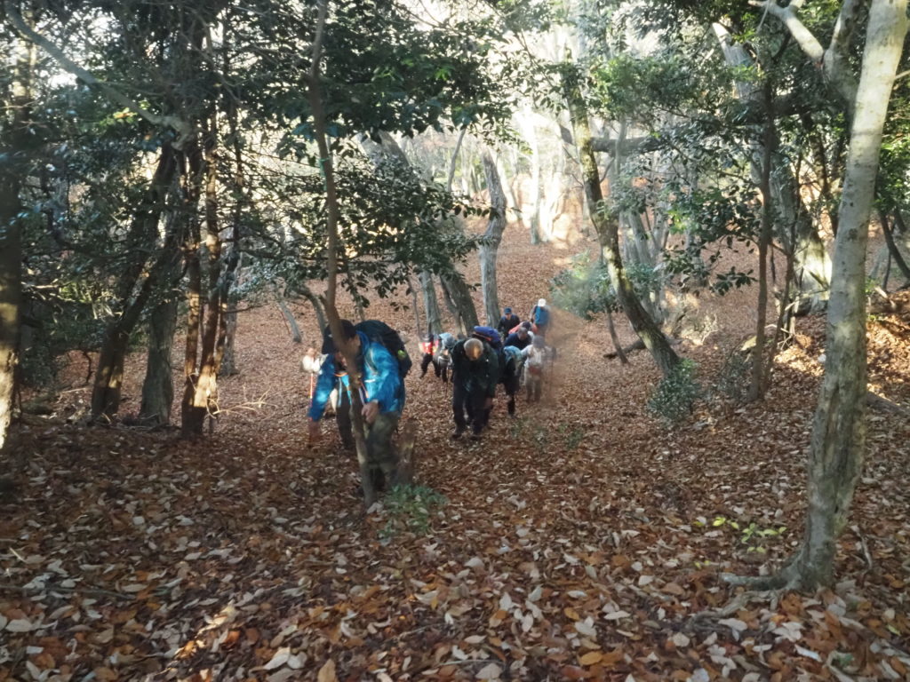 納会大文字Bコースは、北斜面をアチコチと3時間をかけて探訪し、山頂東の昼食会場に向かうコースである。銀閣寺交差点に定刻の9時に出発し、登山口で朝礼をすます。銀閣寺の借景である国有林の植相を観察する。いきなりアリドオシの小群落や、赤い実が目立つタマミズキ、房状の赤い実のイイギリは、京都では希少種である。常緑のクロバイ、サカキは頂芽が面白い。アオハダの樹皮、ウラジロノキの赤い実、ヤマザクラの老木…などとゆっくり観察していると、予定コースの三分の一で、既に時間を半分も使ってしまった。中尾滝より右岸の尾根に乗り天ノ原に向かう予定が、時間切れとなり、コースを端折り山頂に向かい、道なき斜面を平行移動して昼食会場に躍り出た。11時50分過ぎ、事なきを得た。やっぱり大文字山でも、まともに観察すれば山頂まで4~5時間を要する。意外と見所のある山であった。 (写真、文 服部)