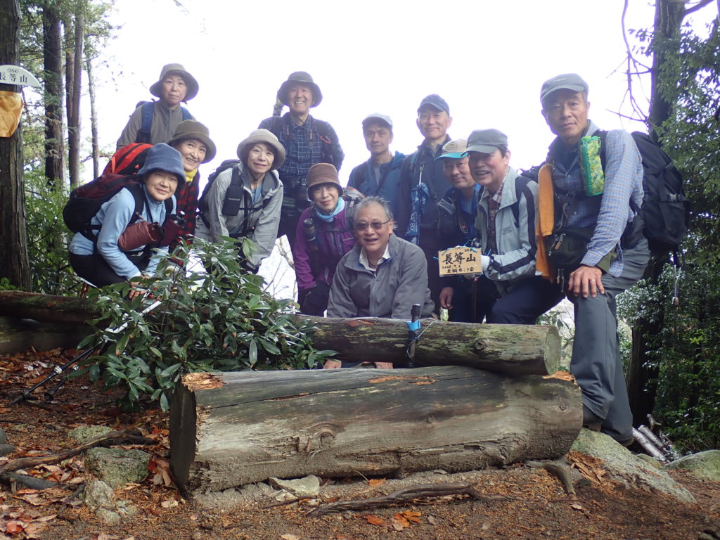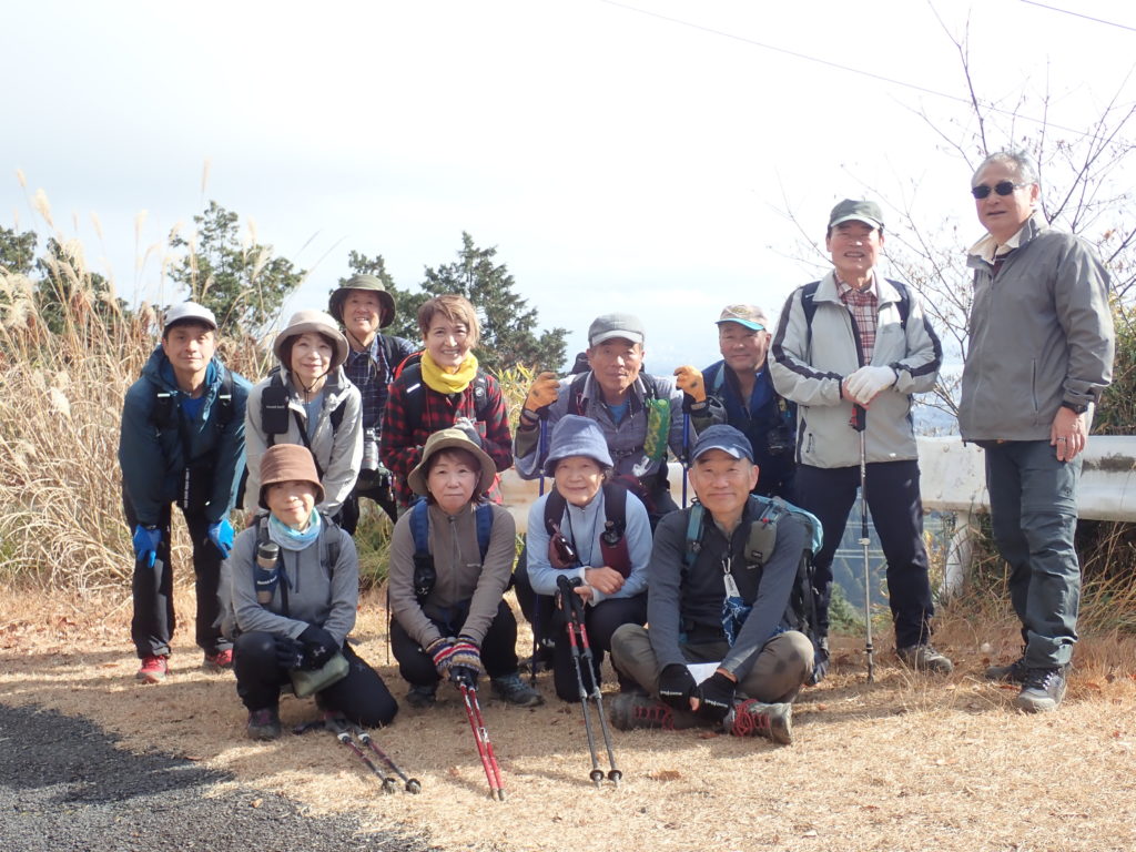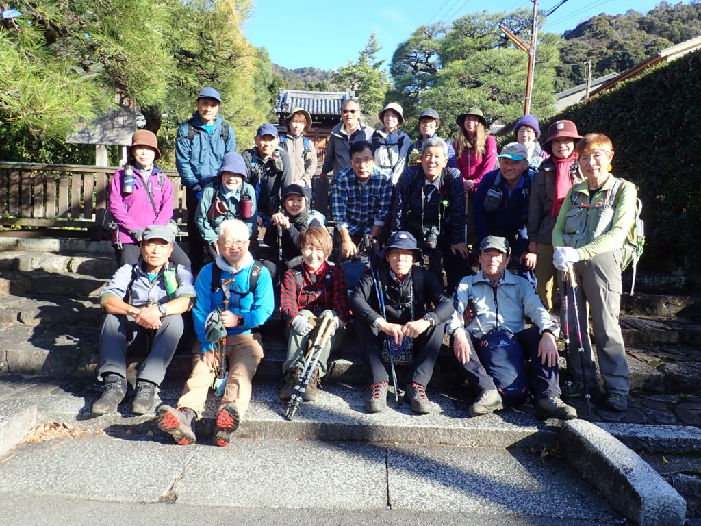 大文字シリーズの最終回は、納会のCコース。朝8時に大谷駅に集合し大文字山の集合地点まで4時間のロングコース。距離は長いが、逢坂山を下り長等山に登る以外は、ほぼ平坦なコースを歩きました。山頂で集合写真を撮った後、Cコースの12名+他コースからの参入9名の21名で鹿ケ谷の霊厳寺まで下りて再度集合写真を撮り解散しました。 (三木 記)