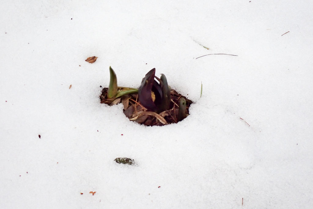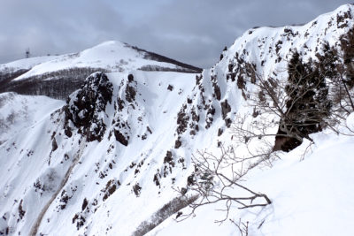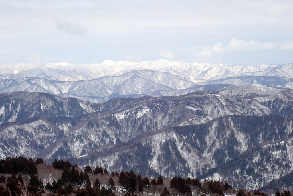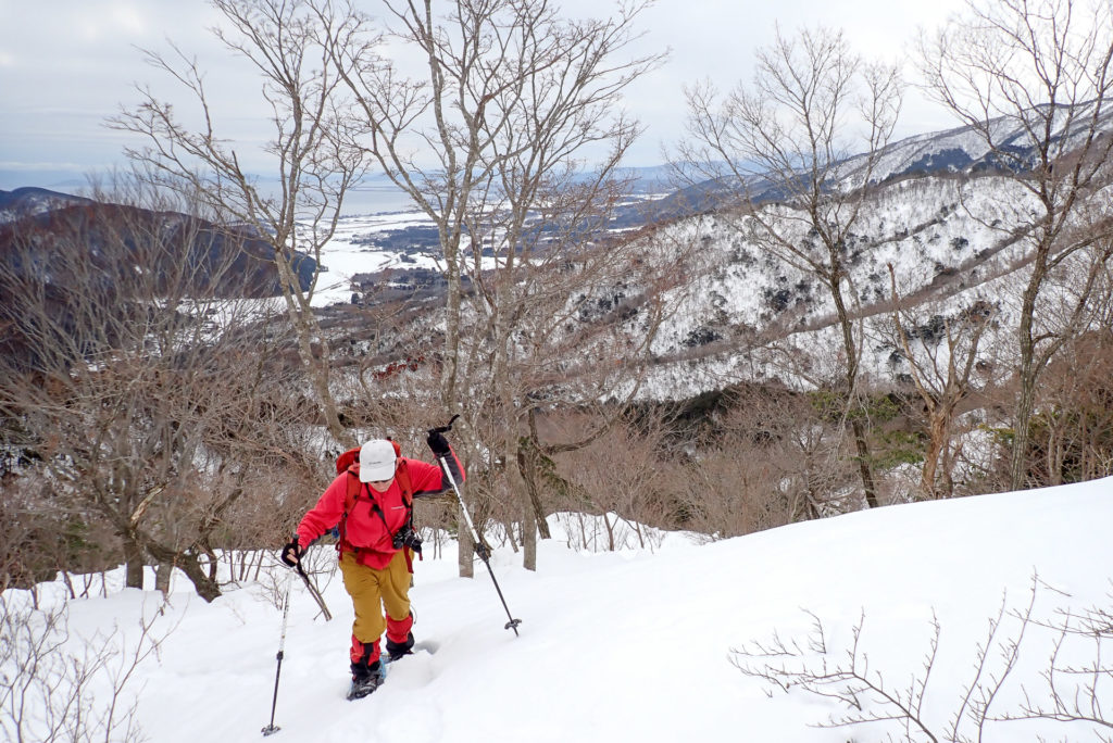 寒波による荒天を心配するが、詳細予報を判断して決行する。幸い、現地では曇り空から時折晴れ間も見える。取付きはトレースの無い登りラッセルで始まる。7つのエンジンで急登も突破、ご褒美の雄大な琵琶湖パノラマポイントで一息入れる。登行を続けると雪に覆われた明王の禿の雄姿が現れる。窪地にて昼食後、雪原を三国山へ。ピークにて湖北の山々の絶景を堪能した後、ブナ美林尾根を下り黒河峠に無事着陸。長い林道歩きの後、駐車地点に予定通りに到着する。帰路、今津の座禅草群生地にて、雪を割って出るザゼンソウを見ることができた。(中島 記)