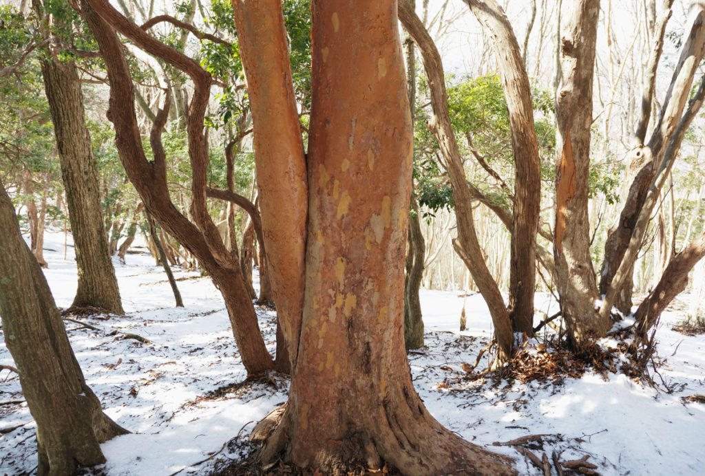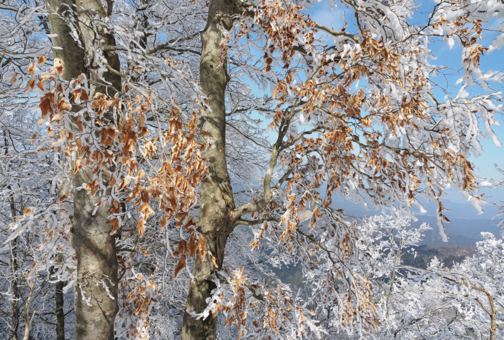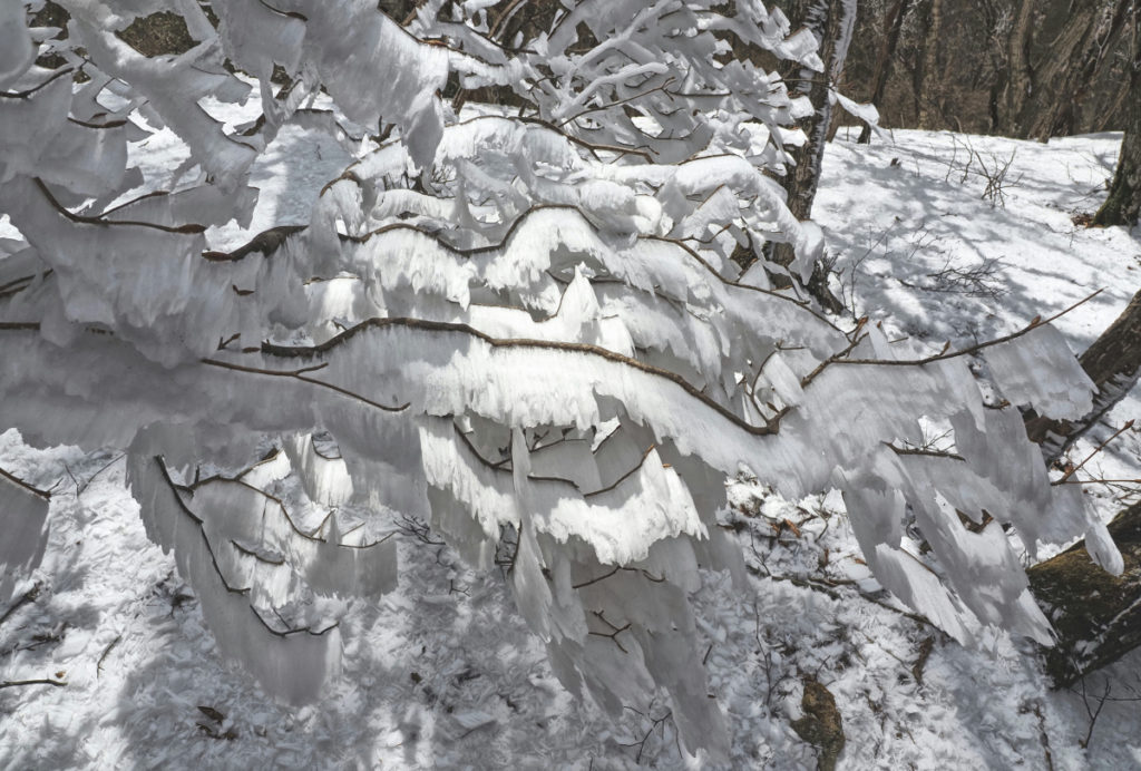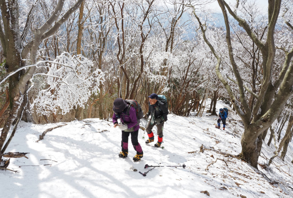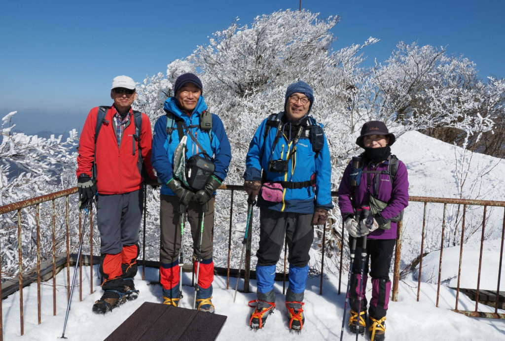 登山口に雪はほとんど無く、樹氷には縁のない日かと落胆しつつ登頂開始した。ところが、標高900m辺りから青空に映える真っ白な樹氷が出現した。樹氷の景色に囲まれながらワーワーと歓声を上げながら頂上まで軽快に歩を進めた。頂上小屋はマイナス3度で手や耳が大層冷たくなった。 (中村 聖 記)