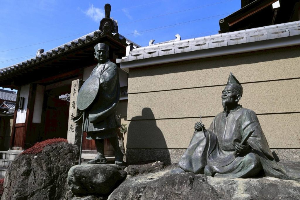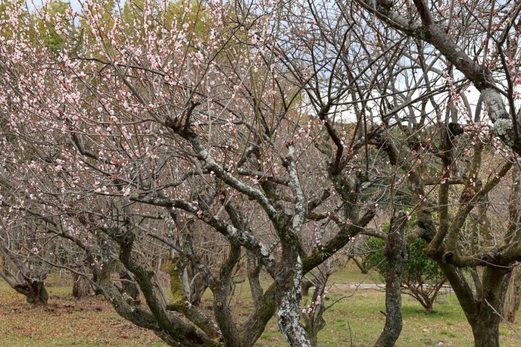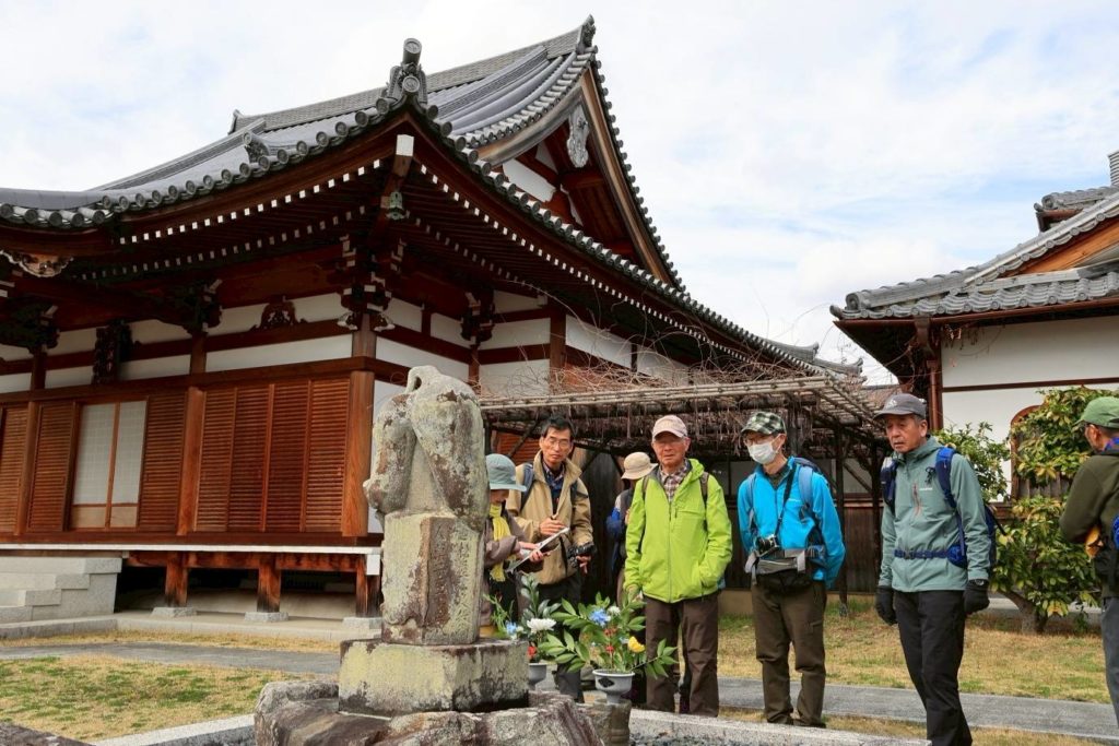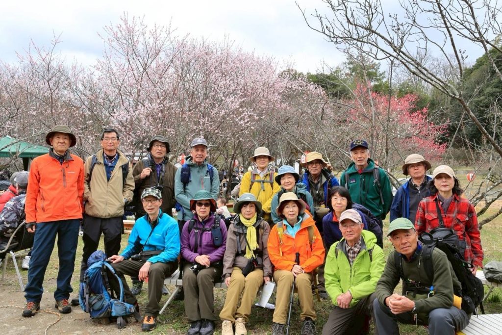 リーダー体調不良の為、及ばずながらリーダーを担うことになった。幸い地元に詳しいメンバーのお陰であまり迷わず(?)歩くことが出来た。重文の水度神社を通り抜けて山背の道を歩いて鴻ノ巣山展望台へ、ここからは工事中の新名神が通る城陽市内と遠くには金剛山(明日例会の)も見えた。山裾は総合公園が広がる。宿泊施設も併設され140mのローラースライダーやトランポリンの様な遊具もある。私達もマットを借りて滑ってみた。最初恐々で、次第に慣れてきて余裕でバンザイやピースサインでカメラに収まる人もいた。少し早めの昼食を五里五里広場の丘でとった。京都と奈良から五里に位置するとリーダーが例会案内で説明していた場所である。城陽の次の駅、長池駅近くに縄文時代後期(約4000年前)の人々の集落遺跡が森山遺跡。大蓮寺も近くにあって面白い「さつまいもの碑」がある。暫く歩いてやっと青谷梅林に、まだまだ見頃の梅は収穫のために育てらいる。町の人達がお店をだして、歌やマジックなどのイベントを開いて梅まつりを盛り上げていた。梅と道真、中天満神社にもお参りして山城青谷駅で解散した。 (文 一瀬・写真 中川)