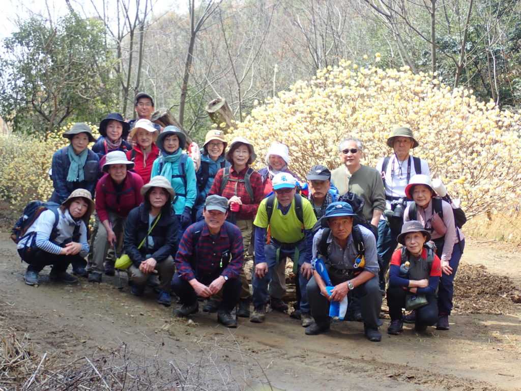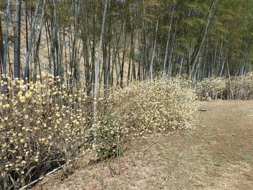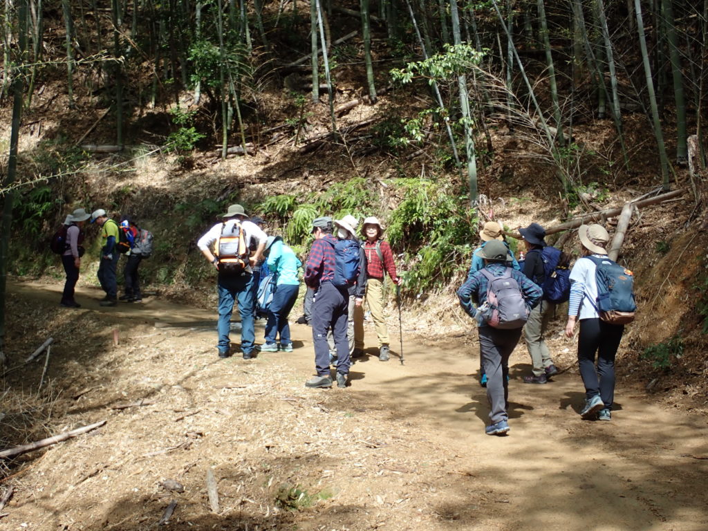朝まで雨が残ったため、道は滑りやすく案内にはスニーカー可と書きましたが、全員登山靴で助かりました。ミツマタロードはちょうど満開。きれいな景色を見せてくれました。帰りに宝積寺に寄るはずでしたが、道を間違えて、史跡「山崎瓦窯跡」に下山しました。(三木 記)