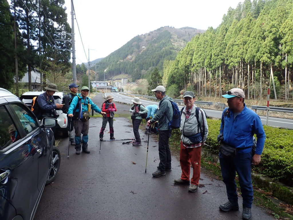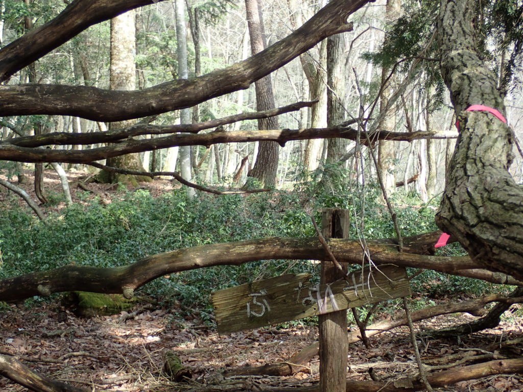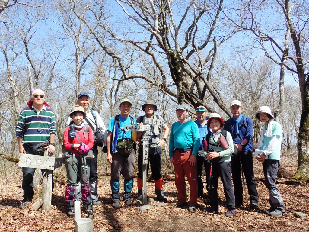 ・コース=出町柳駅:山科駅(7:30)=(8:00)中村と坊村の中間の駐車地点(8:10)~(8:35)鎌倉山登山口~(9:20)ブナ平(9:30)~(10:15)鎌倉山山頂(10:30)~ (10:40)千年杉~(11:20)オグロ坂峠(11:25)~(11:50)峰床山山頂・昼食(12:30)~(13:15)中村乗越(13:25)~(14:20)江賀谷林道終点(14:30)~(15:05)中村小学校~(15:10)駐車地点・解散