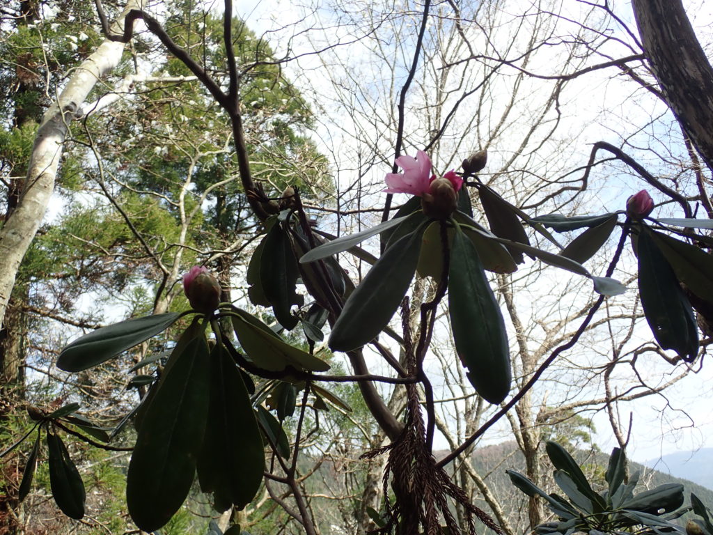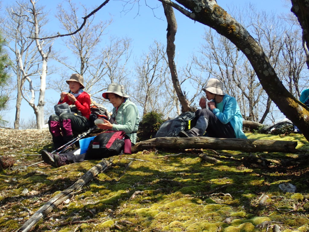 昨日の雨がうそのよう、雲一つない快晴。朝まで雨が残ったため、道は滑るかと思いきや、尾根は非常に歩きやすく、素晴らしい登山日和でした。タムシバ・山桜・イワウチワ・気の早いシャクナゲまで咲き出しました。峰床山山頂で皆子山を見ながらのんびり昼食。帰りは中村乗越から荒れた登山道をへっぴり腰で江賀谷林道まで降りてきました。あとはのんびり林道歩きです。中村小学校の桜が満開でした。 (三木 記)
