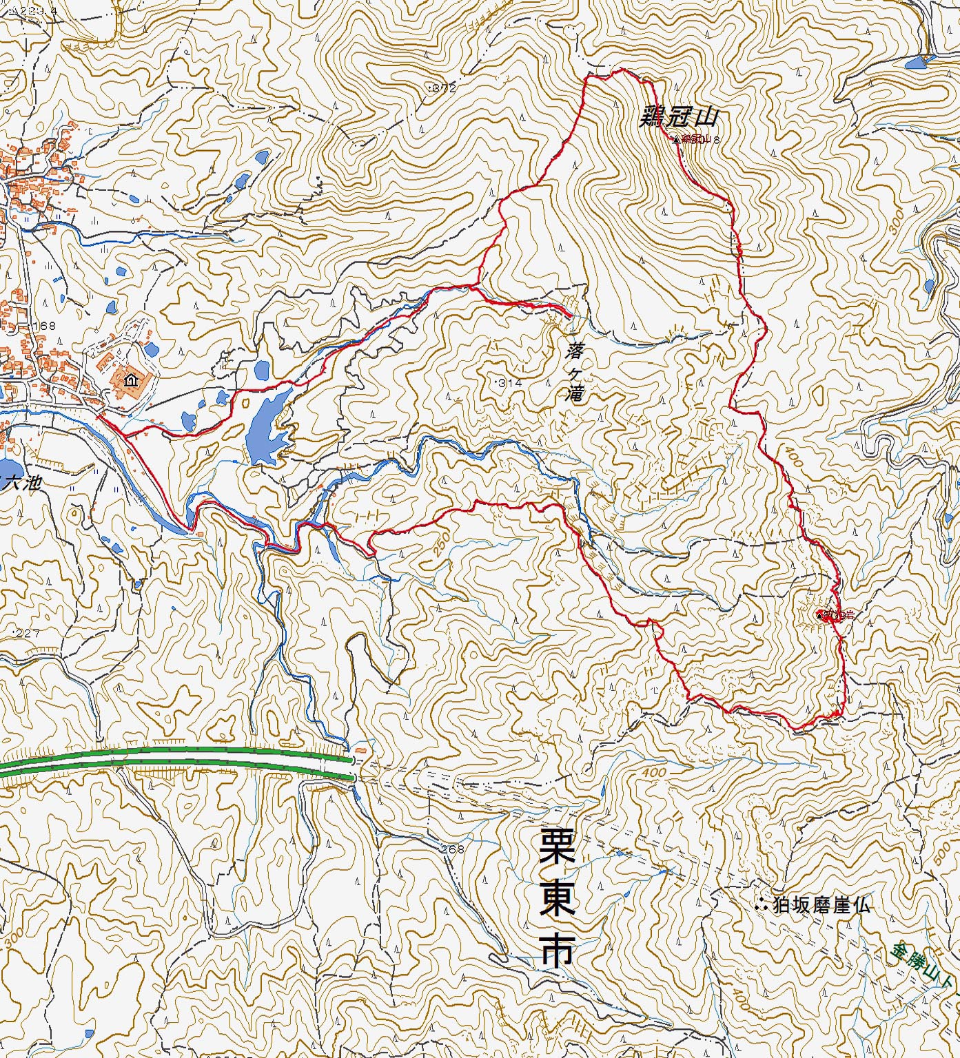 滝から引返し北峰縦走線を登って一気に高度を上げて行く灌木の隙間から栗東のトレセンや三上山が望めそして11時26分鶏冠山に着く。