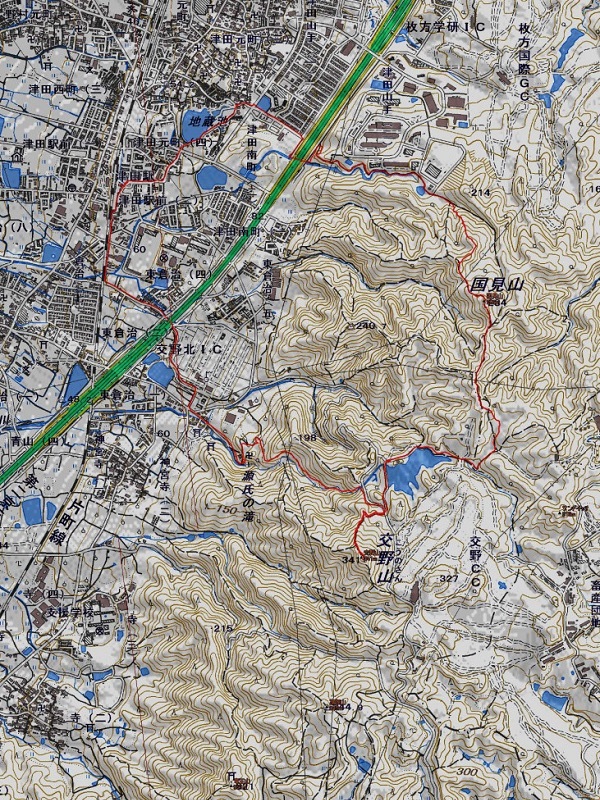 ・コース=津田駅(9:09)〜国見山登口〜国見山〜(11:12)白旗池(12:01)〜交野山〜分岐〜源氏の滝〜(13:59)津田駅