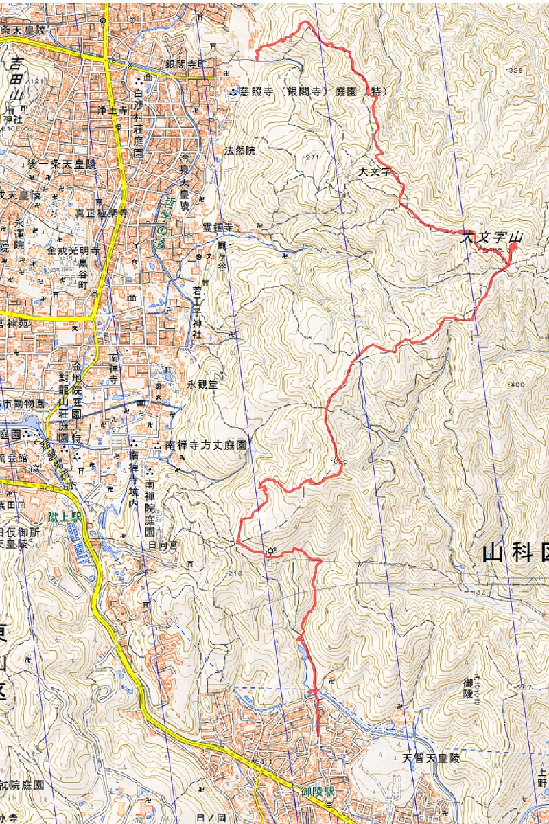 ・コース=(Aコース)JR山科〜毘沙門堂〜四辻奥広場〜大文字山〜中尾城跡〜火床道出会い〜銀閣寺