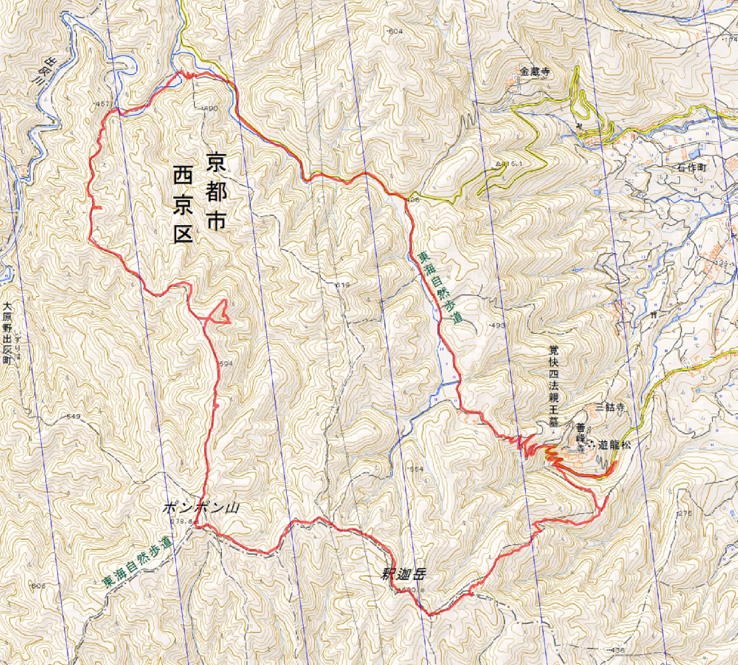 ・コース=善峰寺バス停〜604m〜釈迦岳〜ポンポン山山頂〜西尾根〜リョウブの丘〜福寿草自生域〜出灰出合〜森林管理小屋〜(東海自然歩道)〜善峰寺バス停