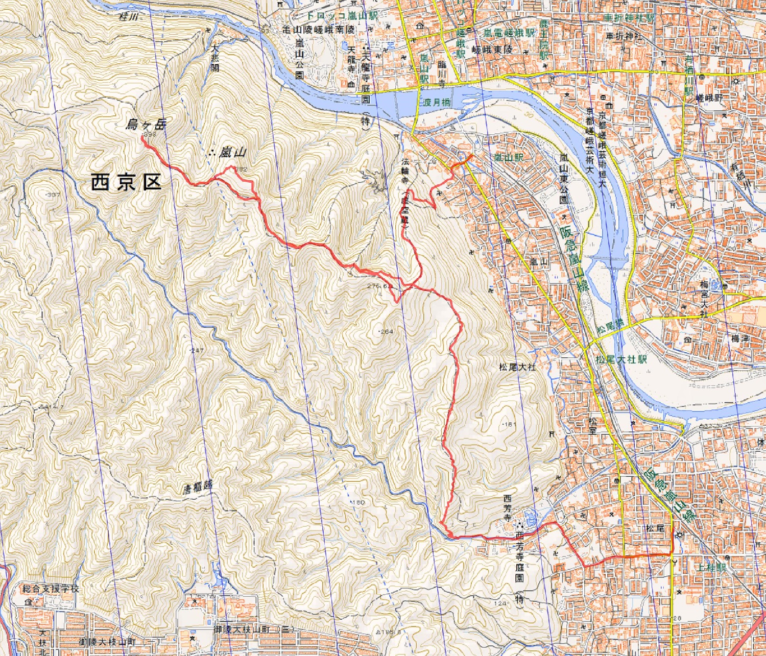 ・コース=阪急嵐山〜登り口〜嵐山〜烏ヶ岳〜松尾山〜西苔寺〜阪急上桂