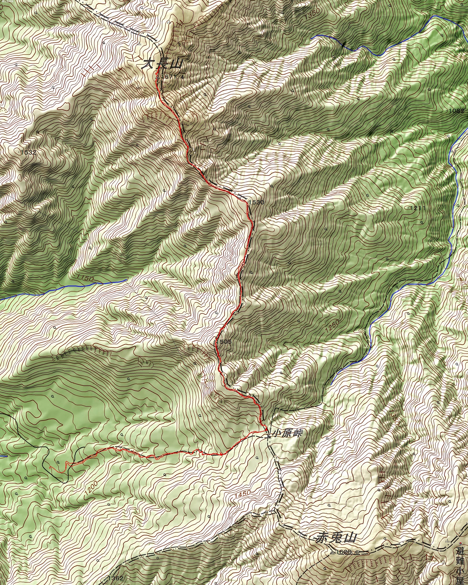 ・コースタイム:登山口(10:09)〜(10:54)小原峠〜(11:30)刈安山〜(12:30)P1400【食事休憩】(12:58)〜(13:17)大長山(13:37)〜(14:33)刈安山〜(15:14)小原峠〜(15:29)水場〜(16:03)登山口