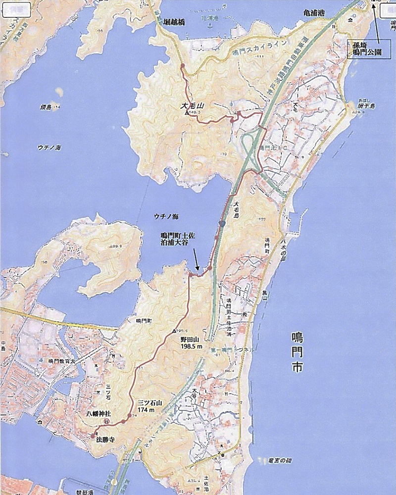 「野田山」からの道は、山名標示板に1987年とあり、30年余り前からの朽ちかけた標示板を誰も変えなかったのだろうか? 三ツ石には説明板を付ける人達がいるのに等々思いながら、枝からと地に這う蔦に悩まされ気を配り乍ら「泊浦大谷」、ウチノ海海岸に面し目の前真正面に行く先の「大毛山」が目に入る車道に下山した。大毛山には泊浦を回り込み海岸沿いに進み高速道路の下を潜って整備された登山道「四国のみち」を縦走、鳴門スカイラインに下山した。 海を近くにし雑木林の中の散策は心和むものがある。道中「ウバメガシ」や「隠蓑」の話が良く出ていたが、一説には要塞の目隠しとして植栽されたとか???(松本記)