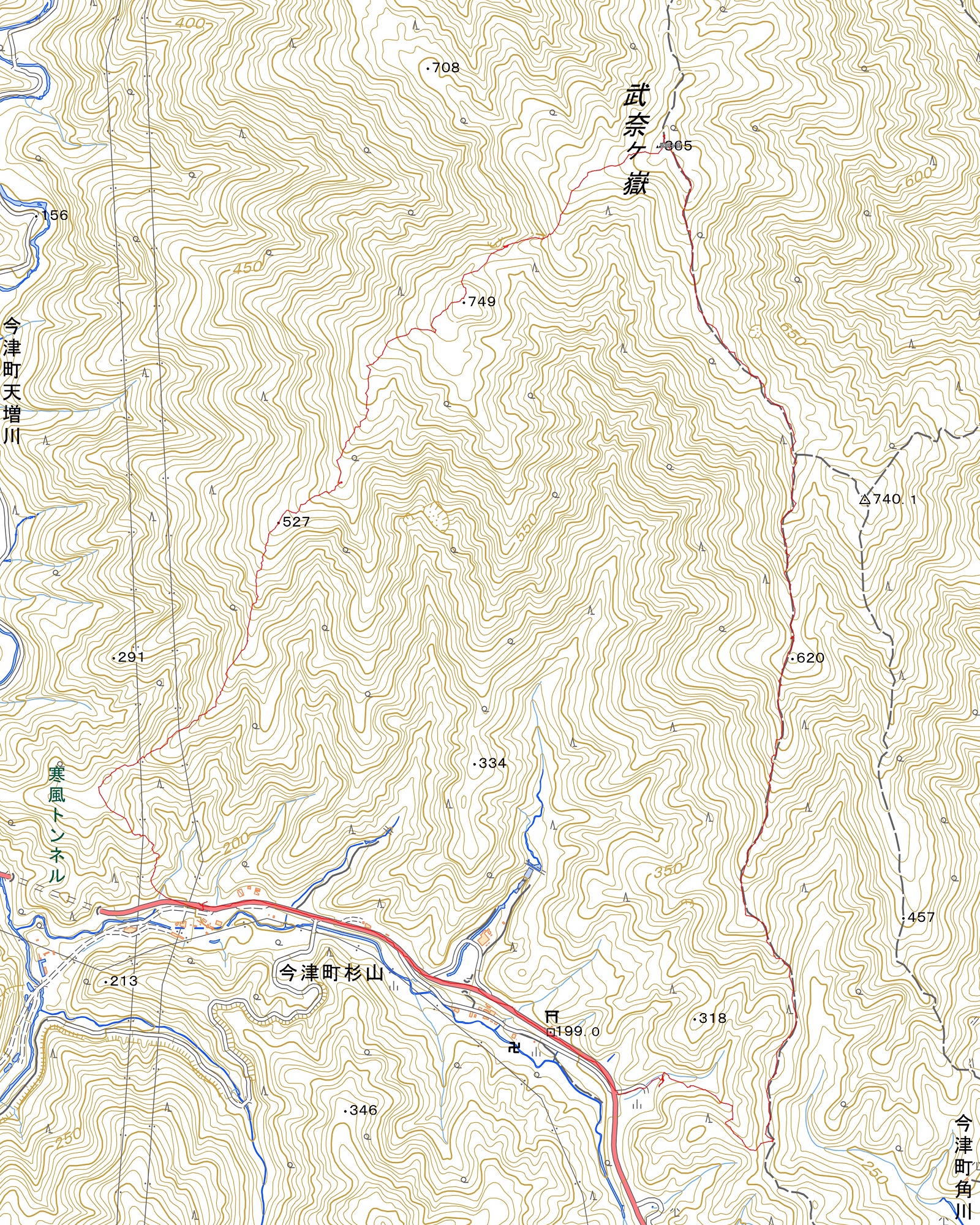 武奈ヶ嶽山頂からは、高島トレイルを南下して、水坂峠に向かう。赤岩山分岐まで緩やかな尾根を展望を望みながら気楽に降りて行く、赤岩山の分岐を過ぎるとけっこう急な所や細い尾根のある斜面をを降りて行く、このピークの裏が水坂峠である標高310m付近の鞍部からは、水坂峠には向かわず、国道303号線にショートカットする廃道の峠道で下りました。順調に下って行ってが見えるところまで来て最後に難所があり50m程引き返し渡渉をし無事に国道に到着する。国道と出合った処でメンバーは待機して、運転手2名が車のデポ地まで車の回収に向かいました。