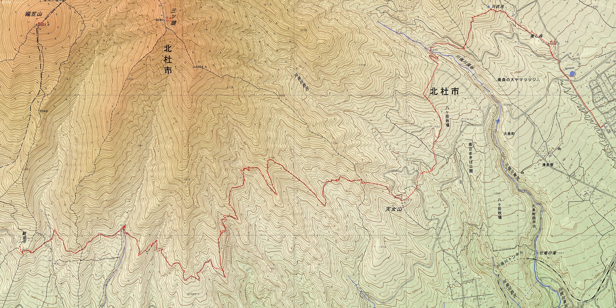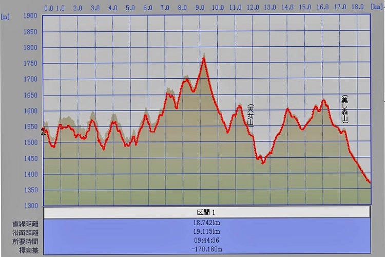・コース=観音平〜三ツ頭登山道分岐〜三味線滝〜つばめ岩〜ツバクラ岩〜展望台分岐〜天ノ河原〜天女山〜牧場展望台〜川俣川徒渉〜羽衣池〜美し森山