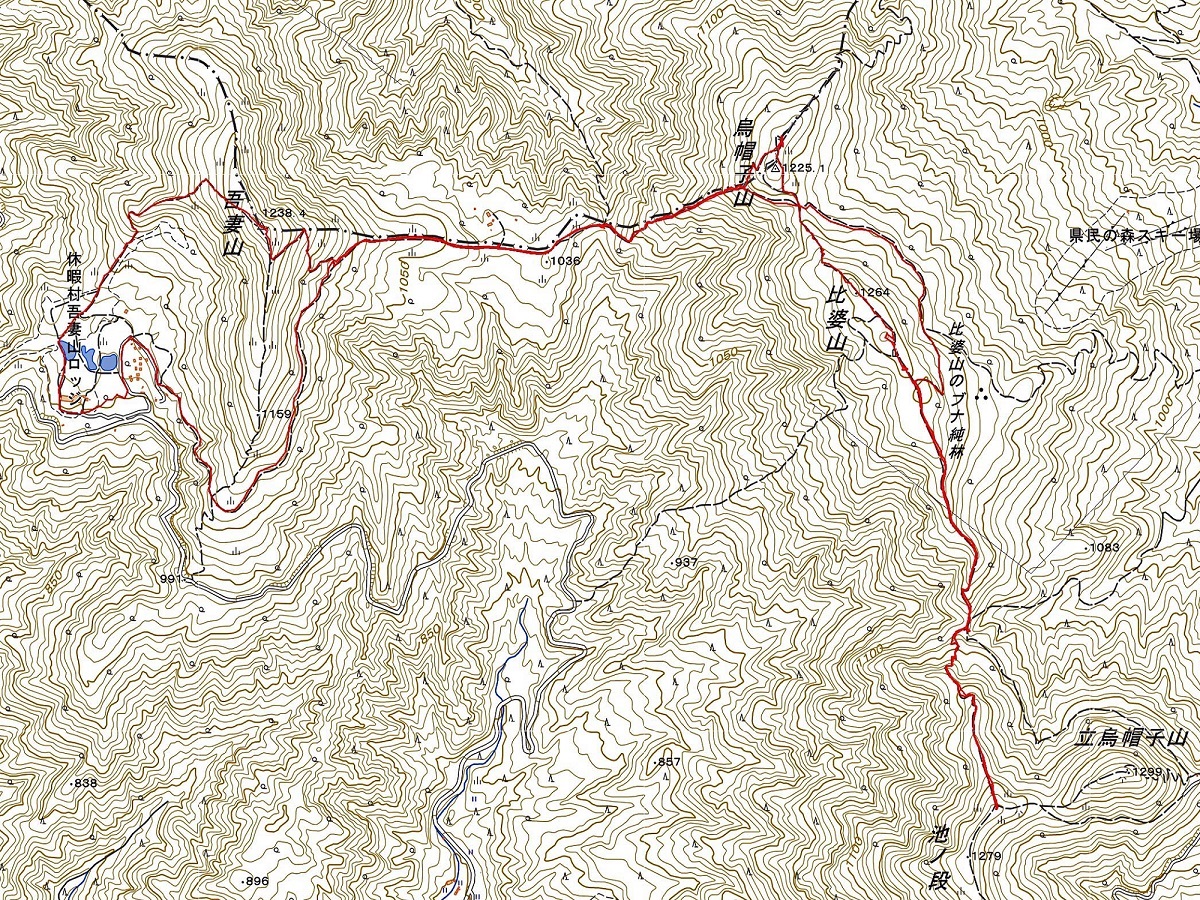 休暇村駐車場からの出立する。吾妻山ロッジの左横から吾妻山を目指して進んで行く、天候が良くて大勢の登山者が詰め掛けている。41分で吾妻山山頂に到着、小さな石柱の4等三角点がある。ここは広島県と島根県の県境に位置している。県境に沿って下山していくと大善原を通過するキャンプ場があり人はいるがテントは見えなかった。先を進み大峠の分岐から烏帽子山の登りに掛かる。烏帽子岩に立ち寄って山頂には立ち寄らず比婆山に向かう、比婆山御陵を通り池ノ段を目指して行く越原越から急坂を登ってやっとこさで池ノ段に到着する。大勢の人でごった返している。ここで食事休憩を取ってから引き返し、いちい古木の手前の分岐から右に入り、ブナ純林の小道を苔むした岩やブナ林の中、静かで人はあまり入って来ないところ歩いていく、コルに出てメインコースに戻りここから烏帽子山に戻らず下山する。大善原を通り過ぎ吾妻山への登りの手前で左に巻き南ノ原に向かい廻り込んで休暇村に帰り着く。吾妻山ロッジは今日で営業を終わり閉鎖されるそうだ。
