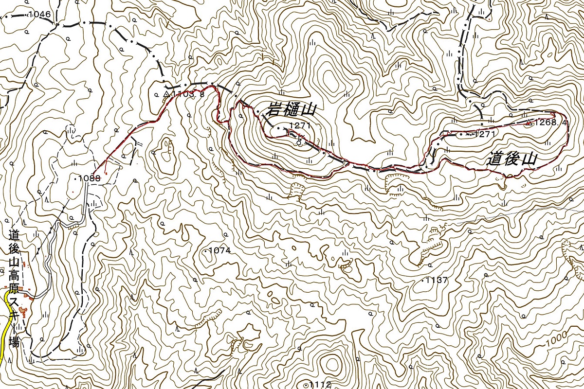 駐車場に着いたときは3台の車が止められていた、登山準備をして歩き始めると一人の方が下山されてきた、進んで行くとまた一人が下山されてきた、道後山と岩樋山の分岐に到着し岩樋山を先に登ることにする。登山道は殆ど階段状で歩き疲れる、途中で駐車場が見下ろせる、車は私の車ともう1台になっていた。岩樋山の山頂に到着すると360度見渡せる展望の良いところだ、ここからは道後山への道がはっきりと見ることが出来るが、月見山駐車場から見えるのは岩樋山だけだった。岩樋山からの下りは岩がごろごろしている登山道を下って行く、下ったところは今は牧場であった所の名残は見られない、緩やかな登りの登山道を歩き道後山山頂に着く。山頂からは北東方向に雲を被った大山が見える、ここも360度見渡せるここの三角点は一等三角点で、ここから先に進み回り込んで戻るコースを歩く。分岐の手前で岩樋山が見えて下ってくる登山者が見える、分岐には私が先に着き私は巻き道に入る、先に進んで行くと前方から来る何組かの登山者とすれ違う、岩樋山への登り口から下って行く、この間にも何組かの登山者とすれ違い人気の山の様だ。思っていたより階段があったものの楽な山登りが出来き駐車場に帰り着く。(廣田記)