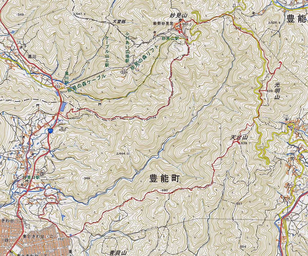 〜(11:29)天台山〜(11:56)光明山〜(13:15)妙見山【食事休憩】(13:53)