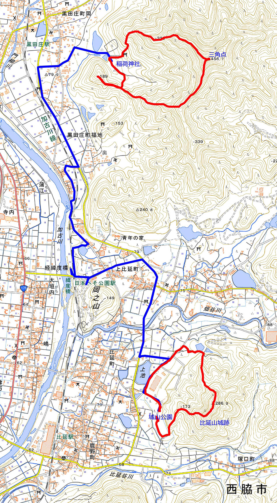 ・コース=西脇市城山公園(9:00)〜(9:40)比延山城跡〜(9:50)比延山(△286.9m)(10:00)