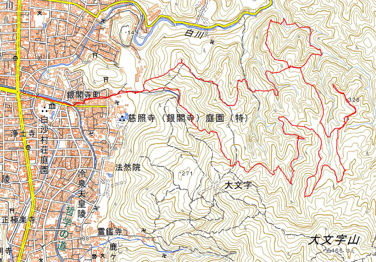 ・ コース=(8:55)銀閣寺道(集合)〜(9:05)行者の森登山口(9:10)〜(9:20)奥の堰堤〜太閤岩