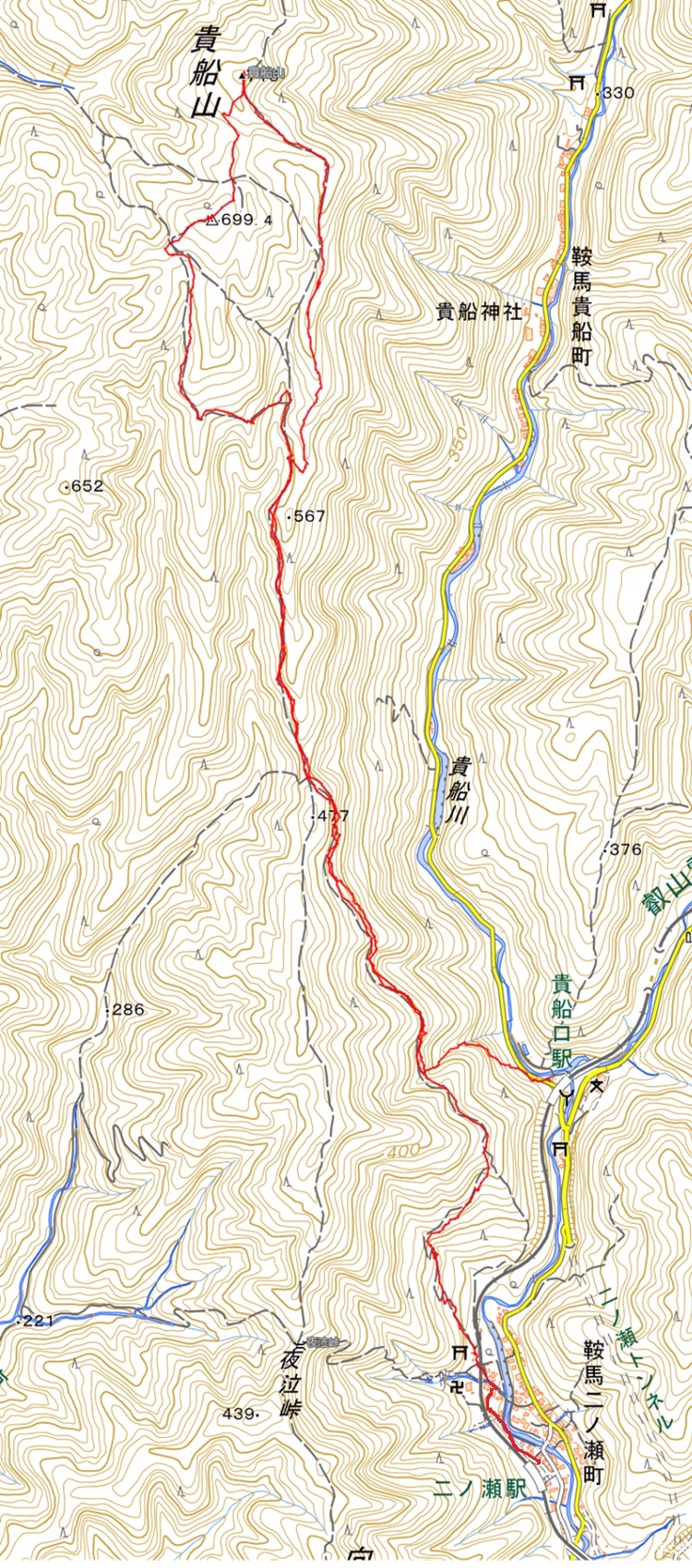 叡山電鉄組と京都バス組に分かれてそれぞれに二ノ瀬に向かう。二ノ瀬駅のホームで待ち合わせる。沿線のライトアップでにぎわった紅葉も今は、枯れた並木だった。富士神社横で挨拶を済ませ出発する。始めは急な勾配だが道は広く整備されて歩きよい。クヌギやケヤキの落ち葉を踏みながら登っていくと標高400m付近からは傾斜も緩くなりゆっくり楽に歩け、迷うことなく貴船山最高峰(独標716m)に至る。二等三角点699.4m(点名、二ノ瀬)に向かい昼食とする。下山はもと来たユリ道を引き返すのだが、樋ノ水峠からの道は、良く踏まれたしっかりした道がついているが倒木で歩きにくい所がある。二ノ瀬までの下山を予定していたが、時刻的な問題を勘案して貴船口に下山しました。距離:約7.8km、累積上り標高:約850m、合計時間:約5時間30分(休憩込み)